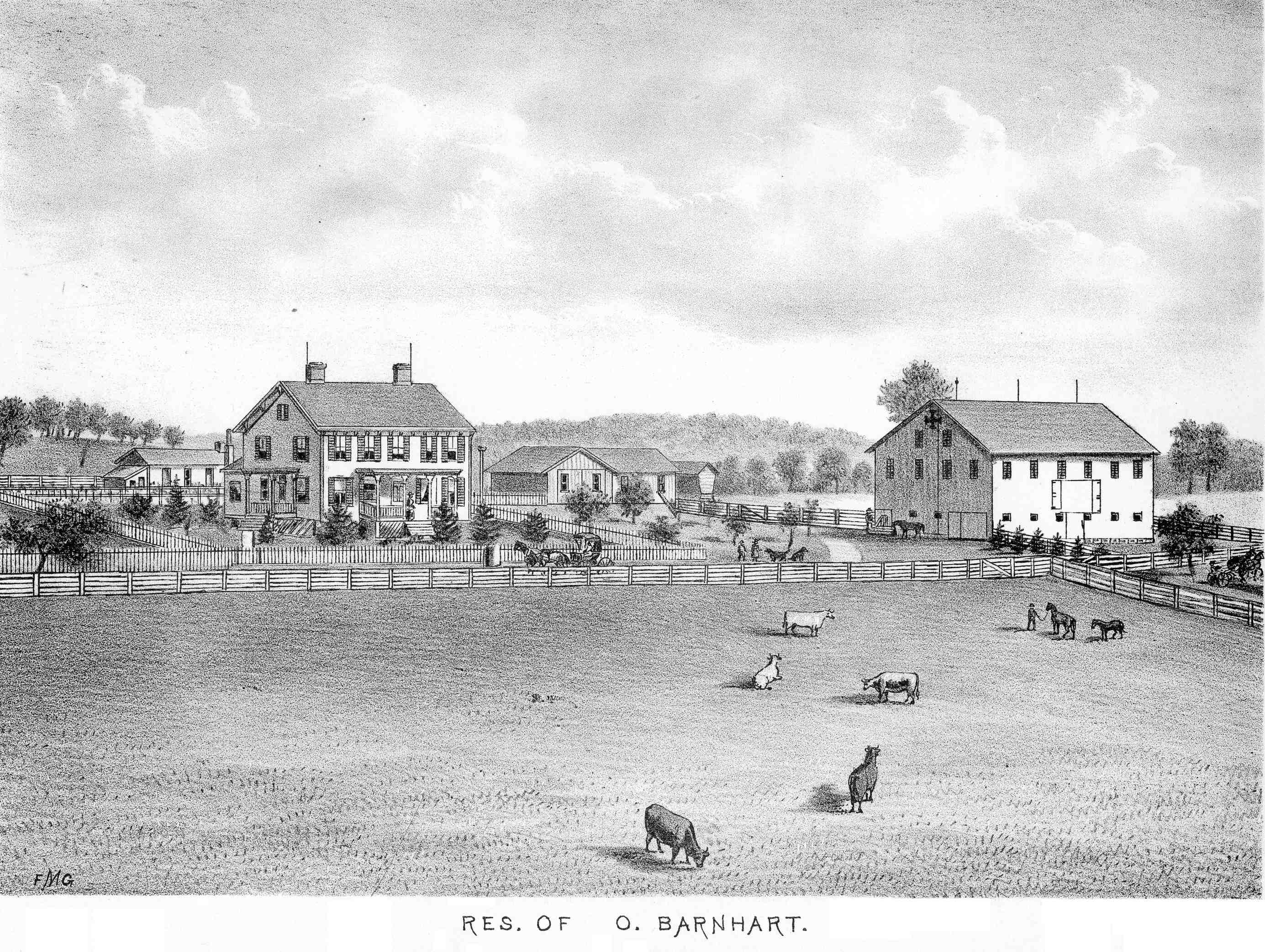 • Residence: View of the residence of Obediah Barnhart from the History of Armstrong County, PA, 1883; pg. 500x.
