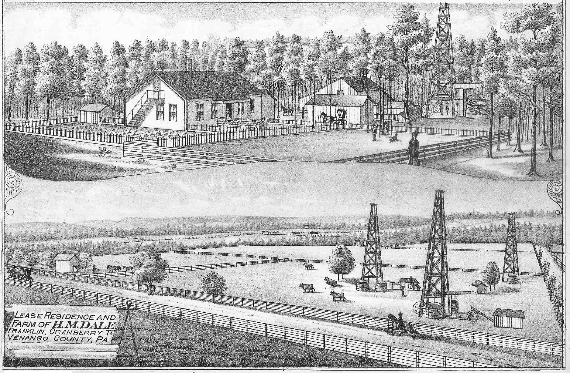 He was a youth when the family settled in Venango County, Pennsylvania. He remained at home until nineteen years old, meantime getting a valuable practical training under his industrious father. He was barely of age when he enlisted, in August, 1862, as a member of Company F, 121st Regiment, Pennsylvania Volunteers, remaining in the service until June, 1864. He took part in many important battles, including the engagement at Gettysburg, where he was shot through the left lung, being so severely injured that he still feels the effects of his wound. Returning home after his military service, he located near Pleasantville, in Oil Creek Township, and for the next five years was en-gaged in the oil business at that location. Selling his interests there, he spent one year in Oil City, until he purchased oil property in Cranberry Township, near Franklin, moving thither in March, 1873. He immediately commenced the production of oil on this tract, which he operated, alone or with partners, having at times as many as seventy wells yielding there. He had another lease on the Henderson farm near Titusville, the operations on these two places keeping him well occupied. His sons shared his interests in the old farm in Cranberry Township where he started operations in the seventies, and one of them, Oscar M. Dale, was in partnership with his father in the opera-tions near Titusville. In 1898 Mr. Dale moved from the farm to Franklin. He had membership in the Methodist Episcopal Church at Franklin, and socially he was a Grand Army man, affiliated with Maj. W. B. Mays Post, No. 220, at Franklin. [HVC 1919, 837]