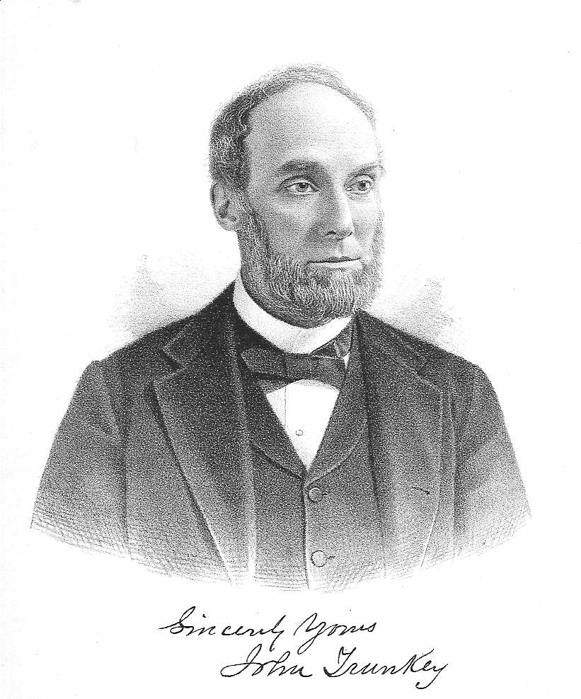 In person Judge Trunkey was about six feet tall, slender, erect in his carriage, and deliberate yet quick in his movements. In manner he was always courteous, and as approachable as a child. He had a wonderful amount of charity and good feeling toward others. No words of bitterness or quick censure ever escaped his lips, but, on the contrary, he always had words of apology and excuse for the evil words and deeds of those around him. There is this crowning fact in his life: from his boyhood until he laid him down to die, in a strange land, he led a pure, sweet and virtuous life. No one ever heard him utter a word, or a sentence, that might not have been uttered in the presence of any company. With all the high positions to which he had attained and adorned, there were, in the judgment of his friends, still greater possibilities before him. But these possibilities were not to be realized in this life, but they are and will be in the blessed life on which he has entered, where the redeemed of the Lord shall be made kings and priests unto God. Such a man was John Trunkey. As a star rises to the zenith without haste, without rest, he rose to a high and higher manhood. He strove for the best thought, the truest speech, the sincerest action. He dealt justly, loved mercy, and walked humbly with God. Surely his life was a successful and happy one. He was happy, too, in his death. It came in the fullness of his mental vigor, before his clear sight was darkened, or his natural force abated. To him it could not come amiss. He lived in the knowledge that life here is a part of life hereafter, and death a transition. Immortality was not with him a theory, but a fact, of which he was conscious. He strove to live as an immortal, and death has consummated his life. [HMC 1888, 1201]