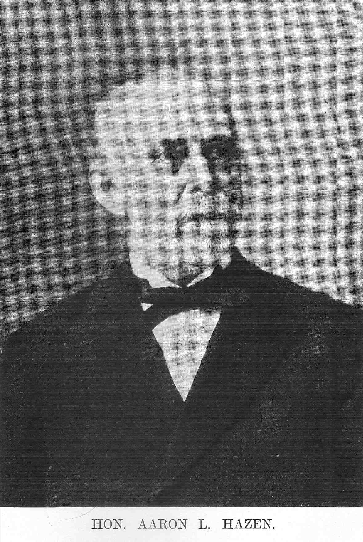 The life of Aaron Lyle Hazen was begun on a farm; he was left fatherless when very young, and has had the usual trying experiences of a boy similarly situated. He was in the last term of his senior year in Jefferson College when Fort Sumter was fired upon. He immediately returned home and enlisted as a private, April 19, 1861, in Company H, Twelfth Regiment, Pennsylvania Volunteer Infantry, served with his regiment in Maryland, and was mustered out August 16, 1861. Being unfitted for further active service, he was refused re-enlistment. He served thereafter as paymaster's clerk until December, 1863, in the pay district of the Cumberland, Louisville, Kentucky, save when he served as captain of Company A, Fourteenth Regiment, State Militia, which was called into active service and served in Maryland during September, 1862. From January 1, 1864, he served as teller in the United States Depository in Louisville, Kentucky, until the close of the war.