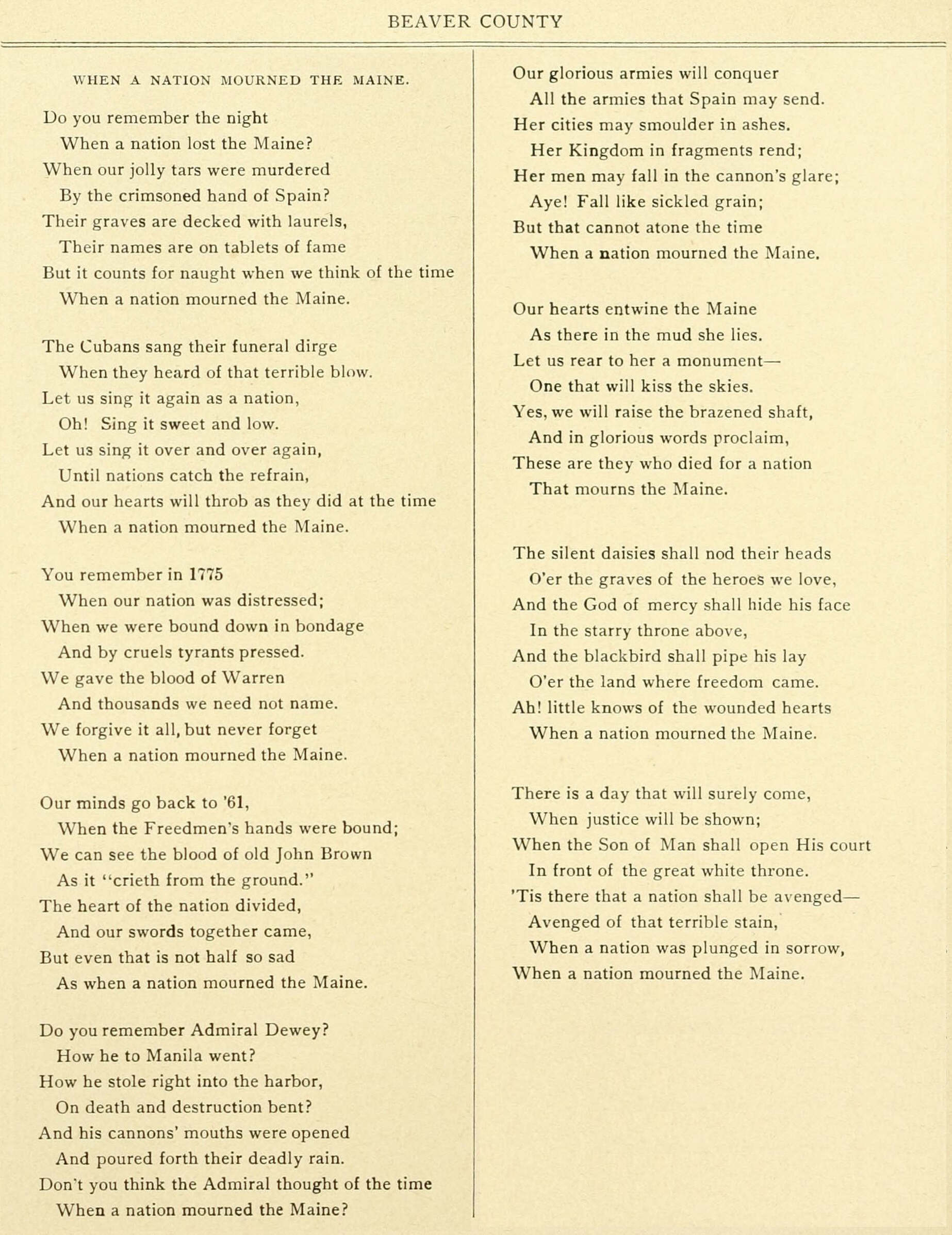 • Document: Book of Biographies, Biographical Sketches of Leading Citizens of Beaver County, Pennsylvania (Buffalo, NY: Biographical Publishing Company, 1899). This page gives one of Dr. Davis' poems. It was written when America was at fever heat over the destruction of the battleship Maine, and when first given to the public at New Cumberland, West Virginia, was enthusiastically received.