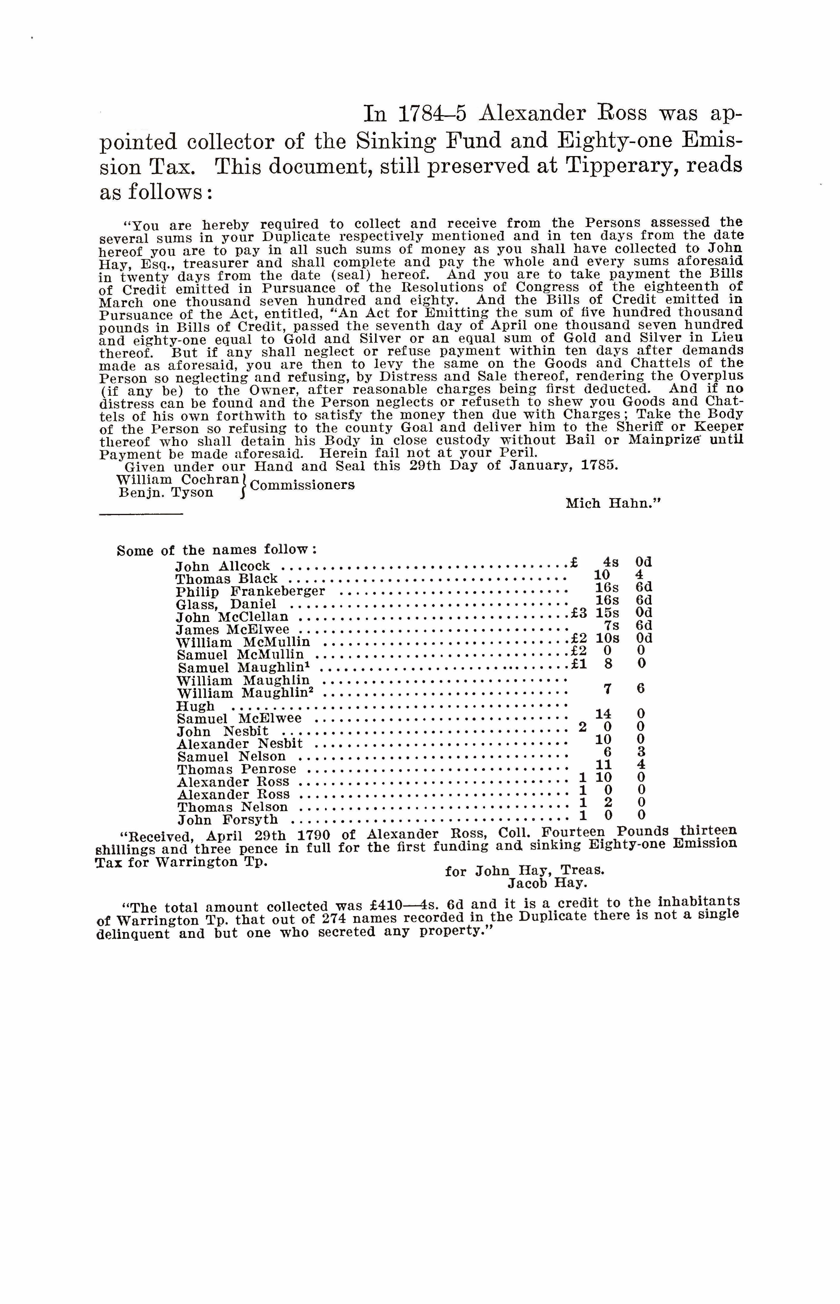 Oct. 9, 1782, Alexander Ross was appointed judge of elections for York County. In 1784 he was appointed collector of the State Supplies for Warrington Township. In 1784-5 he was appointed collector of the Sinking Fund and Eighty-one Emission Tax.