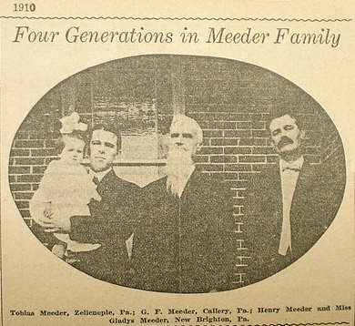 • Photograph. Original clipping from the Pittsburgh Dispatch, 1910, featuring four generations of the "Meeder" family of Zelienople, Callery and New Brighton PA. Identified are the following: Tobias Meeder, G. F. Meeder, Henry Meeder, and Miss Gladys Meeder.