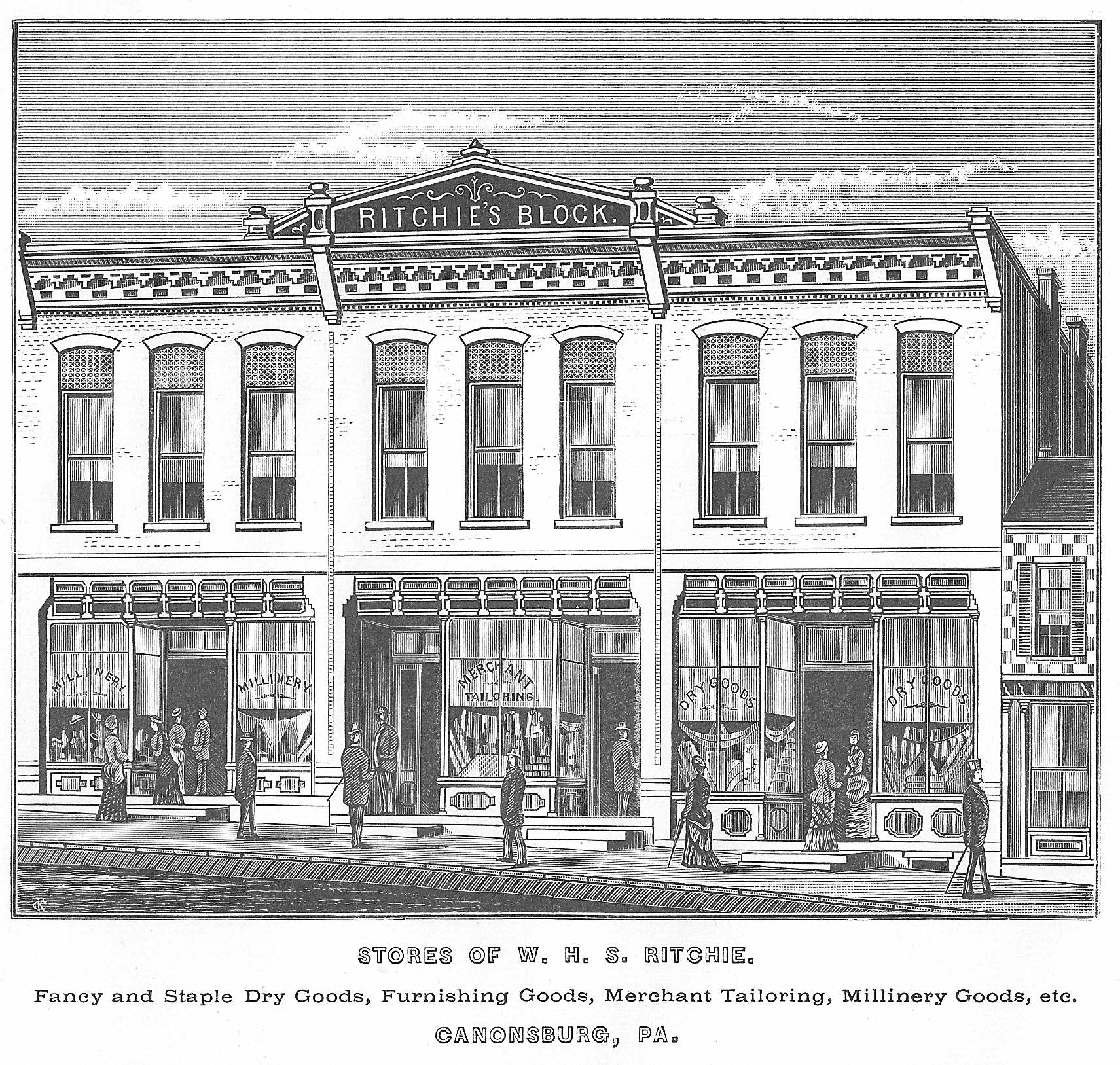 He received his education in the schools of Canonsburg, Washington County, Pennsylvania. When ten years of age, in 1860, he entered his father's store as clerk, and was for the next ten years thus employed except when attending school. From 1870 he became permanently connected with the business, and for three years prior to 1875 its principal management devolved on him. In 1875 he purchased the store of his father, after which time he carried it on in his own name. In the latter part of 1877 and first of 1878 he built a large store building, and occupied it in April of the latter year. The building and occupancy of a store of its magnitude was the inauguration of a new era in the trade of Canonsburg, and though many of his neighbors prophesied it was too large for the place, the sequel fully justified Mr. Ritchie's foresight and good judgment. His venture gave at once a marked impetus to the trade of the town. A large trade, which formerly went to other localities, was drawn to Canonsburg by the increased inducements offered to customers. Mr. Ritchie later erected still another brick block to accommodate his increasing business.