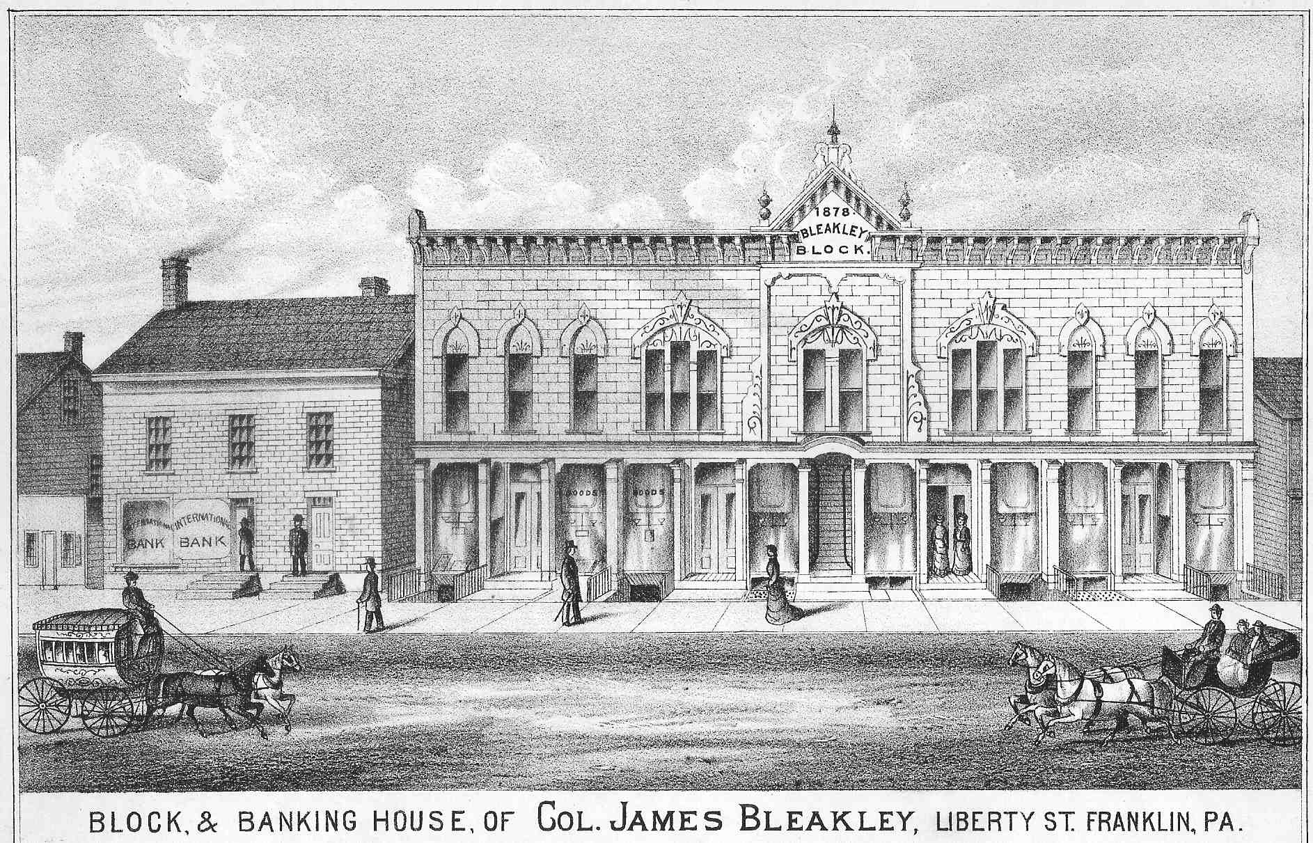Mr. Bleakley continued merchandising for about twenty years. He started modestly, but he had good methods and the assistance of a capable wife, and within a few years had accumulated a little money, which he put into real estate in Franklin and elsewhere. In 1849 he erected the building on Liberty Street where almost twenty years later he opened the International Bank, one of the most substantial business structures in the city. For two years he filled the office of county treasurer, to which he was elected in 1851. He first entered the banking field in 1854, operating a private bank in connection with his mercantile business, and in 1864 assisted in organizing the First National Bank of Franklin, of which he was cashier from that time until 1867. In 1868 he founded the International Bank, which he continued until his death and in which his sons succeeded him. He was president until his death, and the institution became one of the best known financial establishments in the county under his management. In the spring of 1870 he started a banking house at Sharon, Pennsylvania, in the name of James Bleakley, Sons & Co. Meantime he also took on many other responsibilities, becoming associated with interests of all kinds in this vicinity, including a tannery, foundry, oil refinery and tinning establishment, real estate investments and various branches of the oil business, with which he was associated from 1859 until his death; he was one of the purchasers of the Galloway tract and outlot No. 8, famous for their production of Franklin lubrication oil. In addition to looking after his own affairs, he took a leading part in the administration of the government of Franklin, served in the council of the borough and later of the city, and was burgess for several terms. One of his special projects was the care and development of the public parks and other improvements for the beautifying of the city. Politically he was a Democrat in his early life, joining the Republican Party in 1856, and supporting it to the end of his days. [HVC 1919, 528]