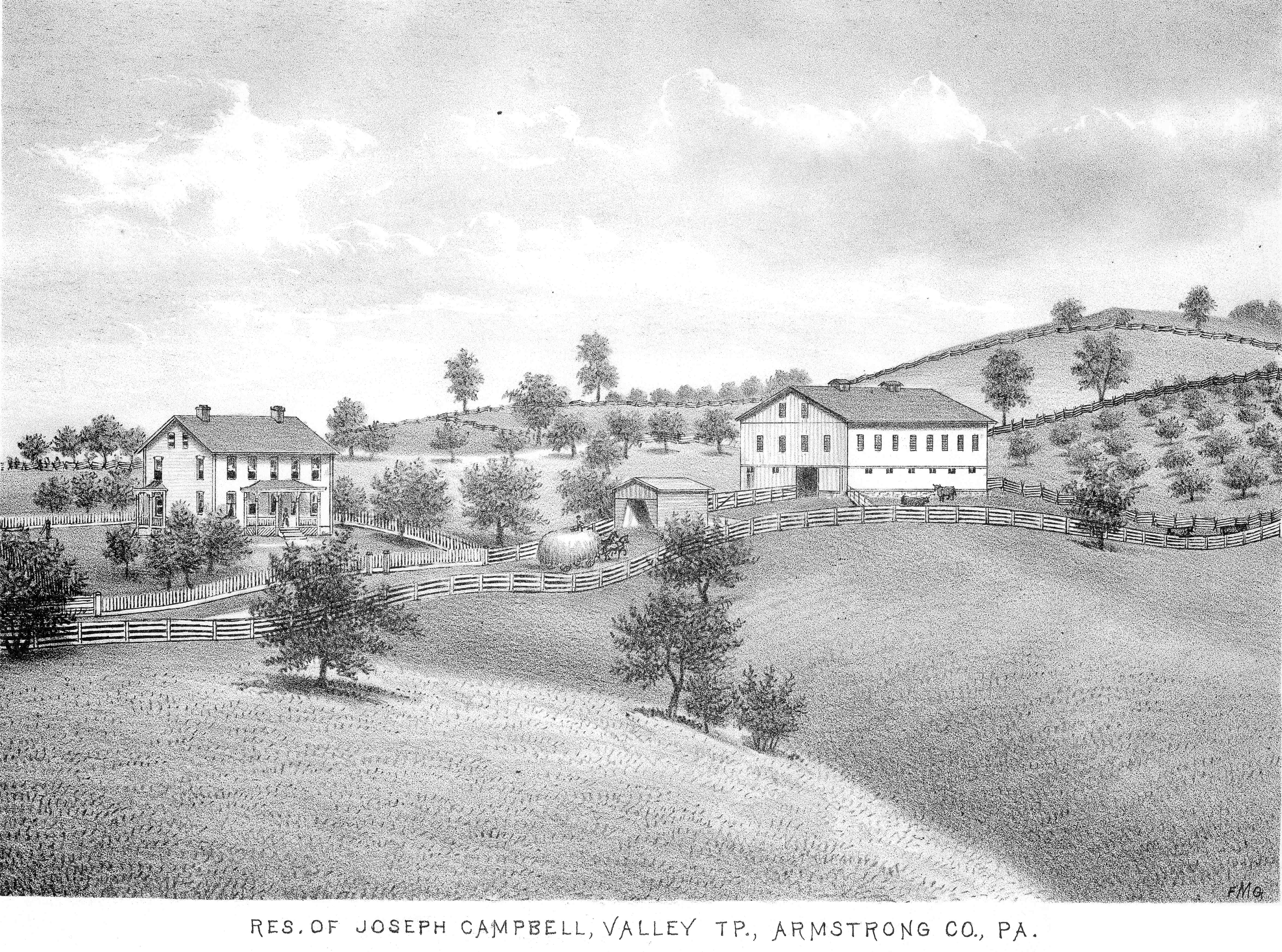 • Residence: : Valley Twp, Armstrong Co, PA. View of the residence of Joseph Campbell from the History of Armstrong County, PA, 1883; pg. 380x