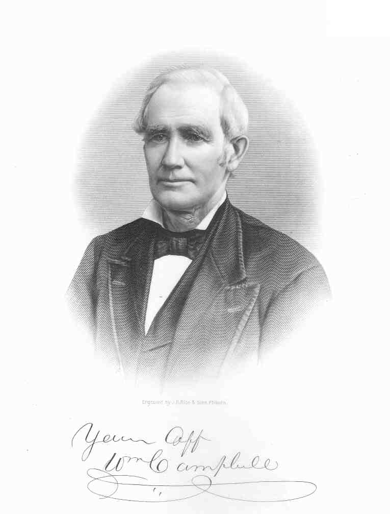 In politics, William Campbell was a life-long Democrat, faithful to his party but seeking no office. Through his interest in the cause of education, however, he consented to serve on the School Board, which he did for several years. A Presbyterian in religion, he became a member of the church of that denomination in 1832. In 1841 he was elected one of the ruling elders, and for many years he was an efficient superintendent of the Sunday-school. [TCHBC, 1090]