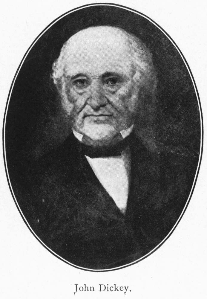 He was born at Greensburg, Westmoreland County, Pennsylvania, and came to Beaver County about 1812. He settled in Old Brighton, where he became a clerk at Barker & Ormsby's iron furnace, of which, with James Stockman, he finally was owner. He was the first postmaster in Old Brighton, being appointed April 11, 1818, and served as prothonotary of Beaver County from 1821 to 1824, and as sheriff from 1824 to 1827. In May, 1827, he moved to the tavern stand at Brady's Run, to superintend the building of the Brady's Run bridge, for which he had the contract. He removed to Beaver in 1830, where he remained until 1836, when he returned to Sharon (Brady's Run), and opened one of the largest mercantile houses in the county. There also, with his relatives, Samuel and Milo Adams, he established various industries, such as boat-building, salt-works, a saw-mill, etc., and was interested in the foundry of Jeremiah Bannon and Robert Wallace. In 1828 Dickey and James McIlroy had the steamboat Rhuamah built by John Boles of Bolesville, to run from Fallston and Brady's Run warehouses. The first trip was to Pittsburgh on April 29, 1829, William Reno as captain and John Dickey, clerk. Mr. Dickey took a deep interest in the development of Beaver Valley and of the county, and was honored by his fellow-citizens in being twice elected to serve them in Congress, first from 1843 to 1845, and again from 1847 to 1849. He also served as Senator in the State Legislature two terms, 1835-37, with great ability and distinction, being always devoted to what he considered the best interests of the people. He was appointed United States Marshall for the District of Western Pennsylvania in 1852, but died before the expiration, aged 59 years.